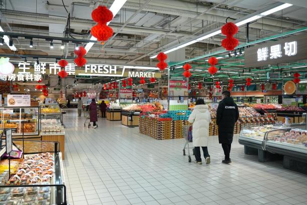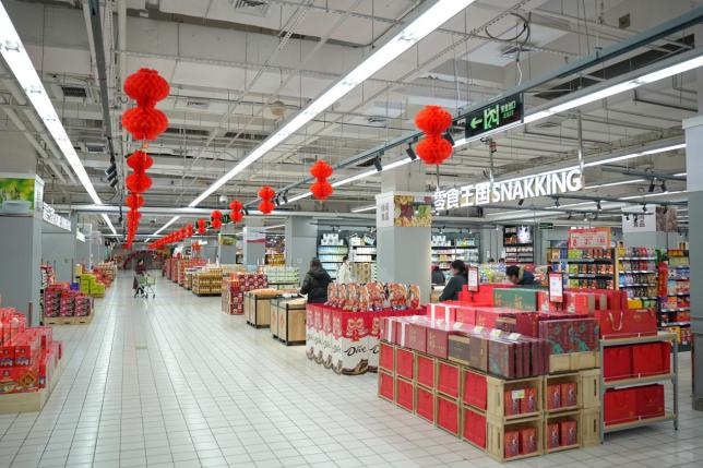 春节将近,备年货成了人们迎接新春的“重头戏”。在华润万家东丽店,到处悬挂着红灯笼,琳琅满目的年货商品已经摆上了货架,前来购物的市民络绎不绝,一派喜气洋洋的景象。