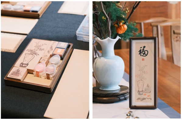 会讲之后,宾客可亲自动手,以拓印的方式,自由搭配花材、果品与小件雅器,书写新春吉语,创作专属的新春清供小品。这不止是一场手作体验,更是一场连接古今的文化仪式,让传统雅致与吉祥寓意,在现代都市家庭的案头悄然绽放,为新年添一抹祥和高雅的底色。