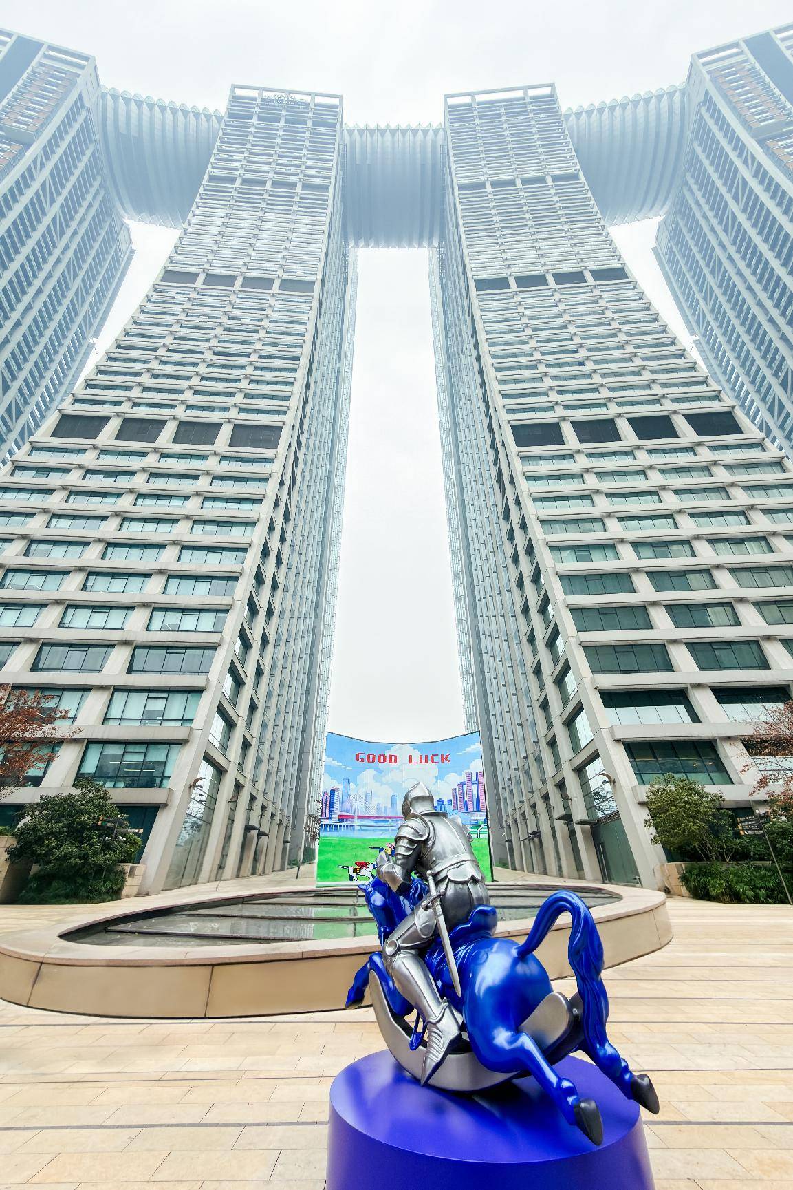 位于2号门(山城花园天井处)廖小舟作品《蓝骑士》以中世纪骑士与疲惫的蓝色摇摇马并置,呈现重庆在高速发展中的多重气质:传统与当代、力量与消耗、游戏与现实。赛马画面中的重庆远景呼应山城立体地形与速度感,蓝色象征江河与科技。置于来福士,这件雕塑以轻松而具象的方式展现城市的活力、节奏与现代景观。