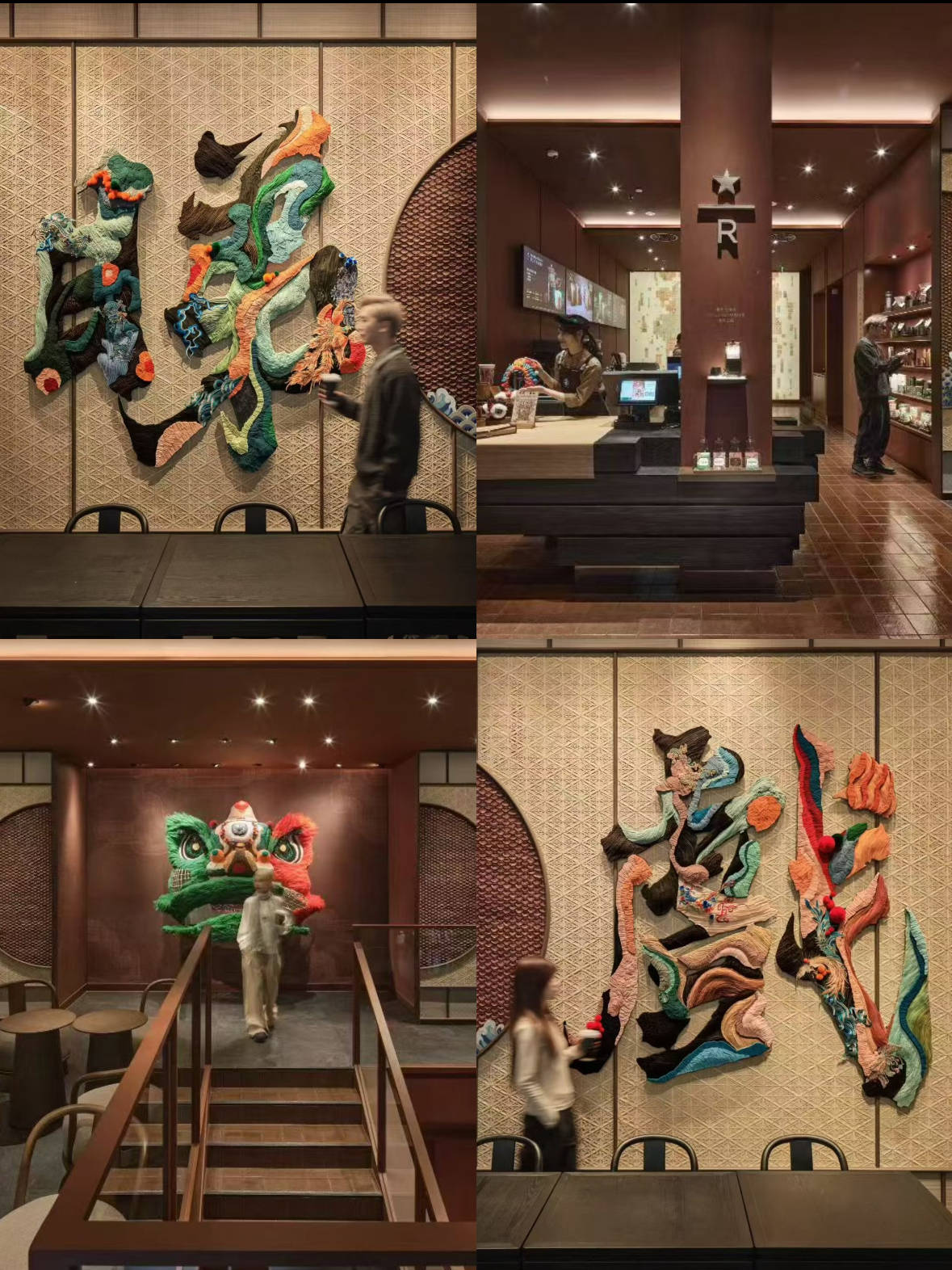 店内设计处处体现非遗与现代的创意融合。一楼吧台墙面的像素化粤剧脸谱,以云南藤编为底,融入咖啡豆纹理与器具元素;二楼楼梯端的非遗醒狮作品,则结合粤剧戏服面料、竹编工艺与星巴克标志性绿围裙,象征广府文化的创新传承。特别引人注目的是由云南藤编非遗传承人陈艳秋创作的《藤鳞戏韵》,以腾冲老藤采用传统“错缝叠压法”编出鱼鳞肌理,其复古红色彩既呼应粤剧舞台,也契合深烘咖啡的醇厚基调。