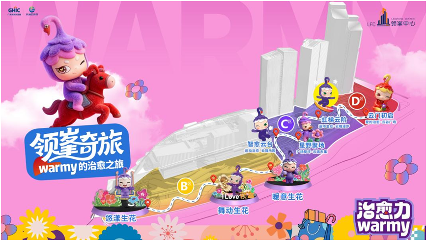 领峯新天地以“想象生花”为核心主题,打造“暖意生花”“舞动生花”“悠漾生花”三大沉浸式治愈力场景。同时,该项目创新性引入治愈系潮玩IP“Warmy”,打造“可漫步、可沉浸、可共生”的治愈艺术生态街区。
