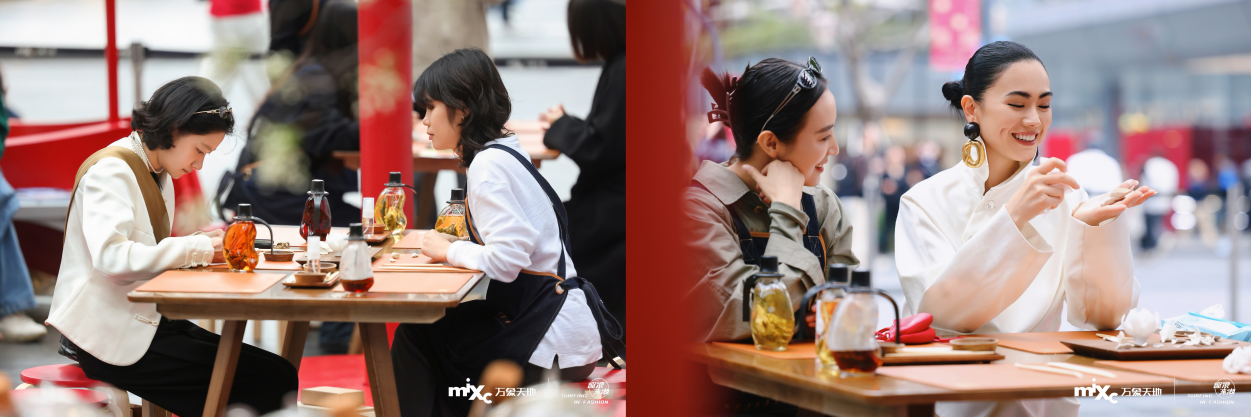MIXTURE从中国新年「合」的核心意蕴中汲取灵感,深度挖掘榫卯「严丝合缝」的东方哲学这一文化内核。以「合」为核,MXTR街区将「合意」化作可感知的游园景致:入口礼序相迎,「合意茶室」暖意氤氲,「合意秋千」藏匿闲趣,「合意庭院」清雅静谧;穿梭灯笼点缀的街巷间,五大非遗品牌错落分布;主题氛围全域延伸,联动美妆、服饰、餐饮等业态,漫溢新年气息。到访者们漫步其间,正是在亲历一场从「形合」到「意合」的非遗新年旅程。