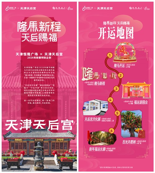 此外,天津恒隆广场亦与天津天后宫首次携手,共同呈现“隆马新程·天后赐福”新春特别企划。此次合作,是百年妈祖文化与当代商业活力的首次深度交融,旨在以一座城市级地标的空间为载体,让静守百年的在地文化走出殿堂,转化为可体验、可共鸣的现代节庆仪式。这不仅是一次商业与文化资源的创新整合,更是推动天津城市人文焕新、促进文商旅融合发展的重要实践,更是为市民与游客构筑一个承载津门年味与福运祝福的新春目的地。