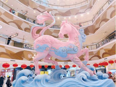 情人节和春节假日期间,烟台大悦城与当代艺术家王小帅合作,深度融合传统祥瑞元素,将《山海经》中“水马”意向重新演绎,与烟台山海之城的特色,以及春节祥瑞的愿景相结合,打造出“瑞云驻福”烟台大悦城2026艺术家联名展。