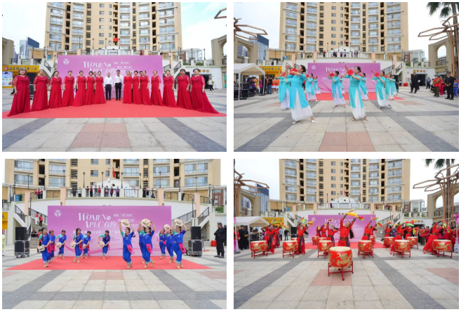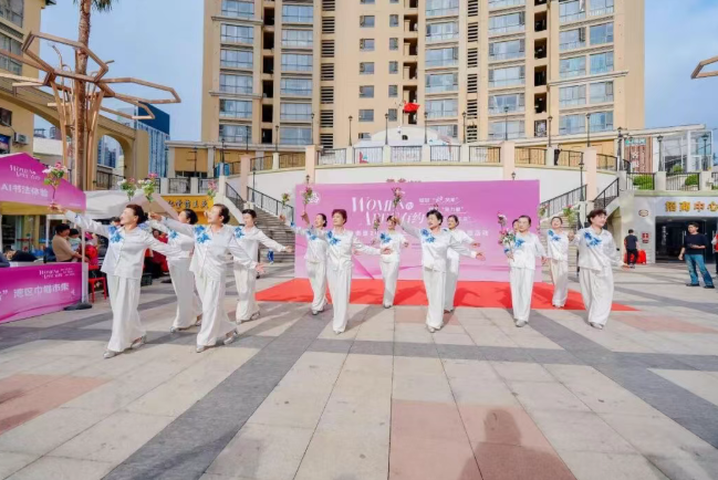 活动现场精彩纷呈。文艺汇演环节,威风锣鼓、模特走秀、京剧、太极、旗袍秀、非洲鼓、草帽舞、合唱等节目在上河坊·港澳湾的开放式空间轮番上演,展现新时代女性昂扬向上、多才多艺的精神风貌。同步举行的巾帼市集设置AI科技体验、非遗文化、特色美食、美妆、健康服务、便民服务、普法宣传等七大区域,融体验、服务、互动于一体,让市民在沉浸式参与中感受巾帼活力与城市温度。