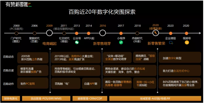在3.0时代,微信生态与线上社交生态开始产生变化,小程序兴起,一大批百购商城开始拥抱“全渠道”,许多数字化服务商开始为百购企业提供数字化基建服务(或有实力的企业自建数字化工具)。在这一阶段,行业开始投入新零售怀抱,“双微一抖+小红书”成为标配,同时也涌现出一批新零售先锋例如银泰集团。