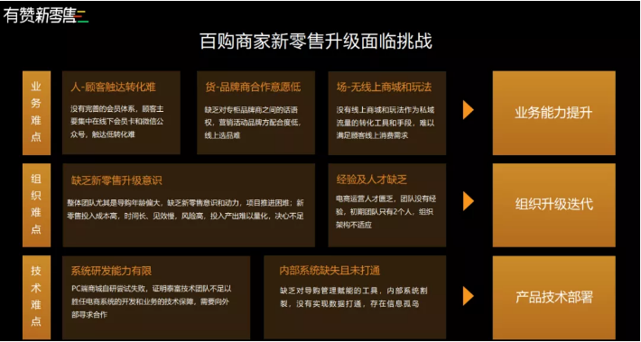 此外,在百购企业内部,团队缺乏新零售的意识、能力和决心不足;同时,收集数据与使用数据链条未能很好打通,高研发成本带来的工具与企业需求适配性低,投入与产出难以量化,一系列难题让项目的转型升级处处受阻。