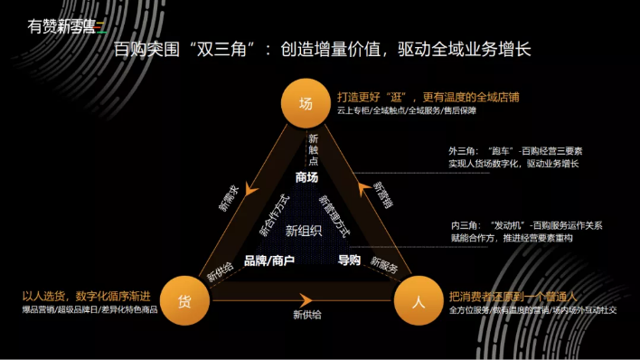 在数字化4.0时代,百购行业需要突破传统的人货场概念。除了关注外部的人货场外三角,还需注重注重企业自身的“内三角”,即商场、商户、导购三大关键角色的提效与赋能,从而通过“双三角”驱动全域业务增长。