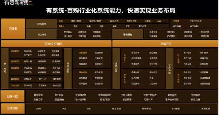 在系统上,有赞基于过去9年产品技术积累,将数字化工具与市场需求深度融合,从全域营销、私域运营、商城经营、门店经营四大维度,打造系列系统和产品组合矩阵,赋能商家快速实现业务布局。此外,有赞洞悉市场趋势并创新推出“云上专柜”等行业定制模块,进一步满足百购行业的个性化需求。