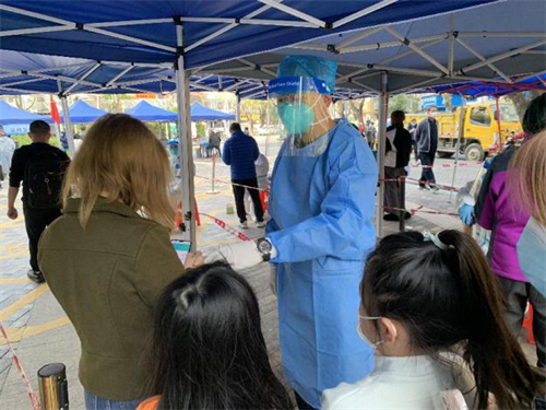 2月25日上午9:35,绿景佐阾虹湾购物中心总经理吴亚男女士与营运部员工身着防护服开始了他们第一天的志愿工作并有序的协助周边居民如何完成核酸检测的第一步操作,看似简单的工作,却有着背后不为人知的辛苦,虽然今天的深圳气候比较冷,但是身着防护服不到10分钟就开始流汗,可想而知,这是一份多么辛苦工作。现场人来人往,老人、小孩、青年,吴总与营运部同事一遍又一遍的复着同样的工作,直至上午11:00结束了志愿工作。