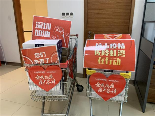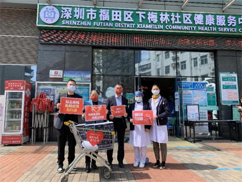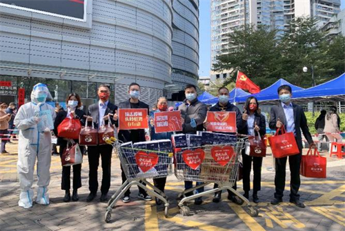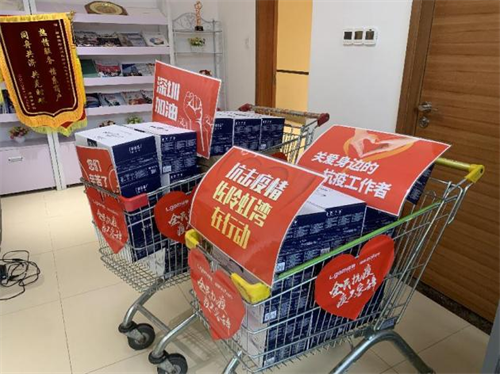 上午11:10,吴总及王总带领虹湾项目当班全员前往下梅社区党委及下梅林社区健康服务中心,送上温暖物资,牛奶20箱、红牛5箱以及场内商户谭厨、点心传说赠送的25份暖心午餐,并为奋战在一线的防疫工作者送上祝福。