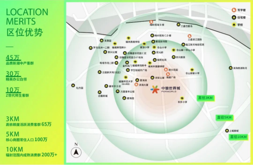 据数据显示,周边3公里范围内,囊括超300个成熟小区,65万消费客群,5km核心商圈常住人口100万;项目周边13所重点学府和超100座商务写字楼环伺。