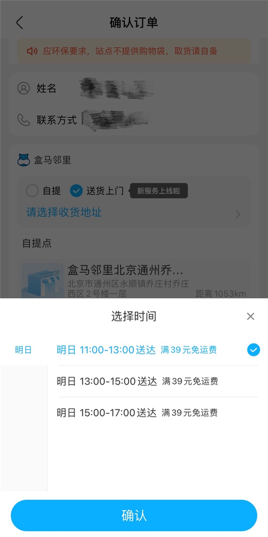 如选择配送,有第二天的三个时段可供选择,并且单笔订单39元以上将免运费,否则需支付3元的配送费用。据悉,用户只需在提交订单时,选择送货上门,并且填写收货地址,在商品上方可以选择希望送达的时间。