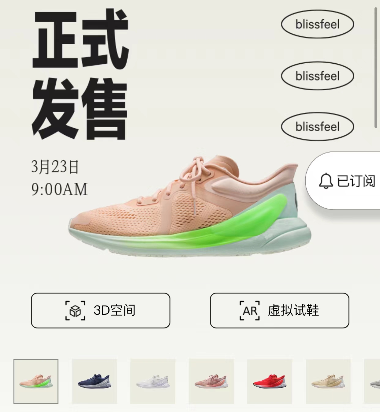 据悉,运动鞋的价格在128-148美元之间,拖鞋价格为58美元。2022年3月23日起,中国大陆市场的部分线下门店与电商渠道将发售Blissfeel女士跑鞋,有十种颜色可供选择,售价1180元,其他鞋款将于未来数月发布。