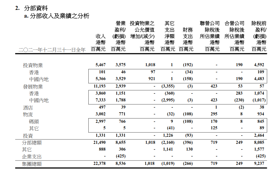 内地发展物业收入减少35%至港币73.33亿元(2020年:港币112.22亿2元);营业盈利减少72%至港币17.88亿元(2020年:港币64.25亿元),录得24%的较低利润(2020年:57%)。