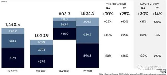 截至2021年12月,公司有267家门店,其中237家是Moncler,30家是Stone Island。2021年全年,公司综合收入达到20.5亿欧元(22.8亿美元),超过了疫情前水平,也超出了分析师预期,主要归功于强劲的美国和中国市场。