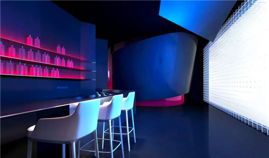 西南首店在装修方面整体呈现出一种“赛博朋克”偏科技感的风格。与其他餐饮店的装修截然相反,黑色的墙壁为食客们营造了昏暗的环境,再搭配上蓝、紫色调的灯光,为店内营造出了一种神秘的高级感。