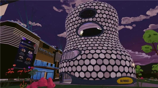 事实上,不止于TX淮海。在上个月的元宇宙时装周上,英国奢侈品百货公司 Selfridges 在 Decentraland 开设了虚拟旗舰店,成为首个入驻元宇宙的商业项目。这间虚拟旗舰店的外形也同样延续了其伯明翰门店的经典造型,同时也联动 Paco Rabanne 和 Victor Vasarely ,打造虚幻又富有现代感的沉浸式空间体验。