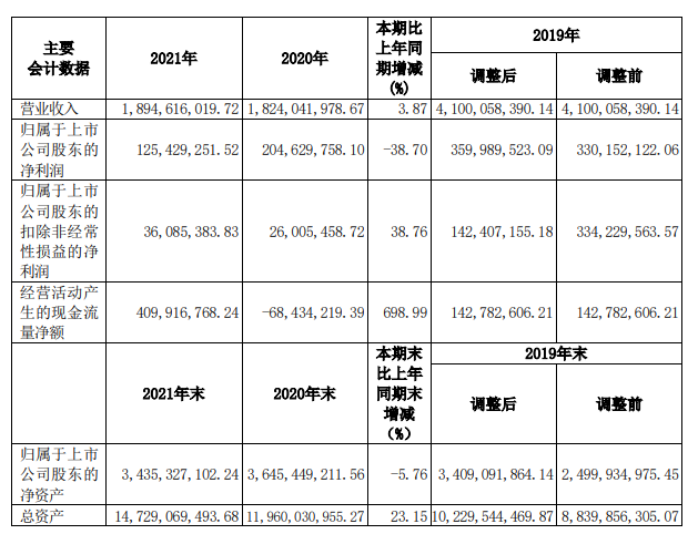 4月21日,福建东百集团股份有限公司(以下简称“东百集团”)发布2021年年度报告。报告期内,东百集团实现营业收入18.95亿元,同比增长3.87%;实现归属于上市公司股东的净利润1.25亿元,同比减少38.70%;实现归属于上市公司股东的扣除非经常性损益的净利润0.36亿元,较上期增加0.10亿元,增长比例38.76%。