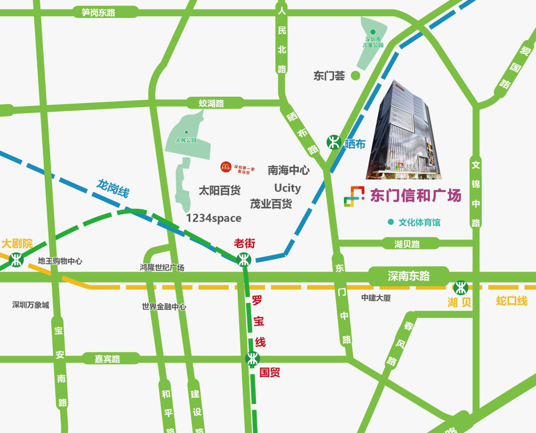 东门信和广场毗邻罗湖火车站(2公里)、罗湖口岸(2.3公里)、文锦渡口岸(1.6公里),无与伦比的地理优势,坐享无限流量资源。