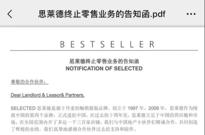 近日,绫致时装(天津)有限公司(以下简称“绫致时装”)发布思莱德终止零售业务告知函。公告函显示,将于今年7月31日前关闭旗下男装品牌SELECTED在中国的所有线下零售。