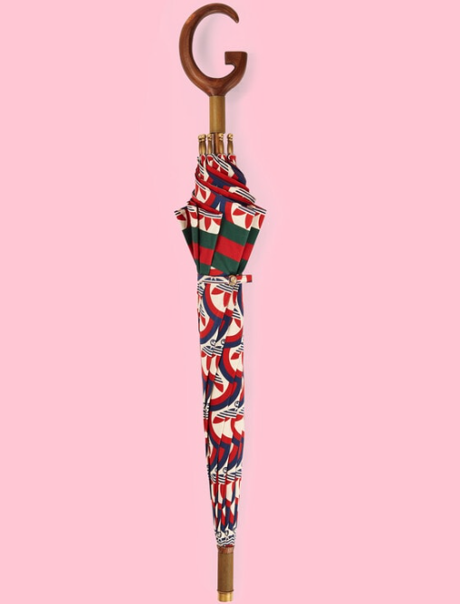 据悉,该系列灵感源自创作总监80年代和90年代的美好回忆,融汇两个品牌丰富悠久的历史传承及标志性的设计语言,塑就风格造型。根据Gucci官网显示,该伞包含了互扣式双G和三叶草徽标,伞身为花蓝色和红色棉麻混纺面料,突出的红绿织带和刻花桦木伞柄也让这款联名产品充满强烈的品牌辨识。