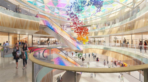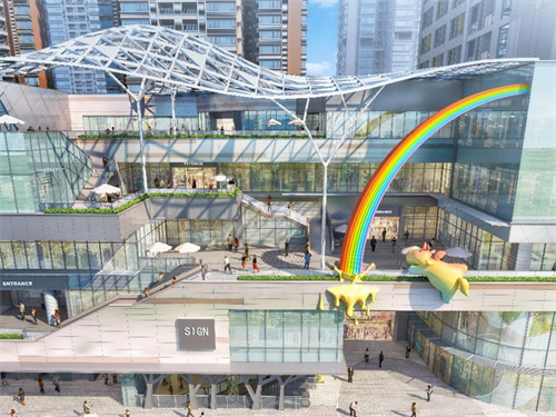 长虹路万科广场,彩虹高街——户外退台立体交互社交空间,由户外梯“彩虹高线”串联起户外社交空间,L3、L5 层彩虹主题空间,L1-L5 层垂直动线,在这里通过主题场景打造美学养成空间、社交舒适空间、亲子陪伴空间,利用多元业态满足邻里、圈层所需的一切生活场景。