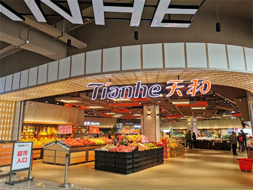 B1 层主题色是新鲜森活蓝,精品超市、克里特小镇主题美食餐饮;