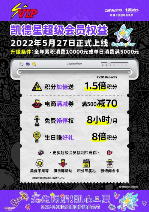 全新推出的凯德星超级会员再次升级,将拥有免费畅停权、美食不排队、积分专享礼、电商满减券、积分加倍送、生日赚好礼、俱乐部活动专属活动名额以及雅诗阁金卡八大专属权益。以此来提升凯德星会员的身份认同感,优化场景及服务,为消费者提供具有会员光环的体验场景,同时丰富会员权益,提升会员内核价值,构建更强韧的互动联结,提升存量超级会员荣誉感和尊享感,促进潜在超级会员消费升级。