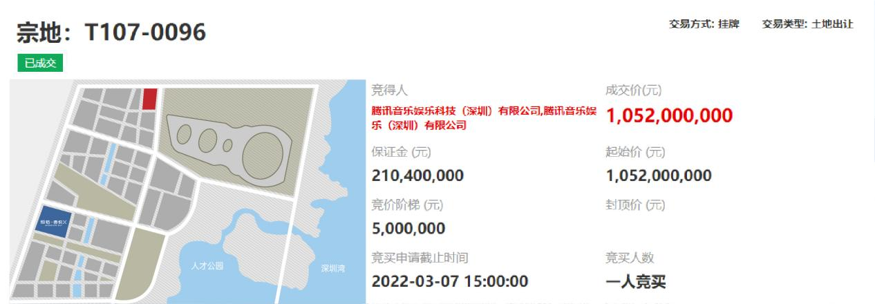 3月9号,作为互联网巨头企业之一的腾讯,再度发力后海,旗下腾讯音乐娱乐科技(深圳)有限公司以10.52亿元成交深圳南山后海挂牌一宗商业用地T107-0096。