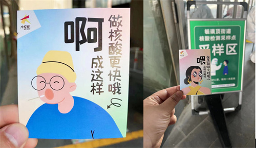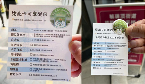 5月28日,烟台新一轮全民核酸检测,在阳光100上班的鲍女士,到楼下进行例行核酸检测。一个漫画风、可可爱爱的小卡片,吸引了她的注意:正面是一个穿着时尚的女孩,正在做核酸检测;背面是绿茶、西贝莜面村、卡尔飞车、幸福蓝海影城等知名品牌的优惠信息,持卡片到店就可以享受折扣。
