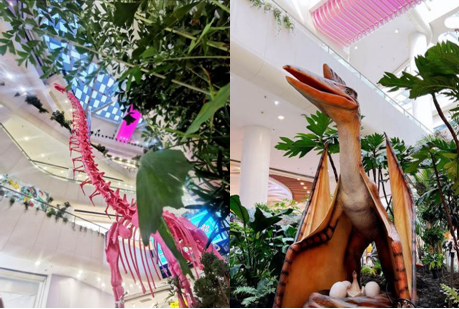 走进购物中心一层中庭,一只高度超过9米、置身于峡谷森林和“粉色海滩”之上的粉色恐龙骨架,将5亿年前的时空和生命美感、以及奇妙的想象力一气呈现在顾客眼前。来到不同楼层,还能发现峡谷森林深处的霸王龙、牛龙、三角龙、迅猛龙等8只“恐龙”掀起掩映的植物,或晃动身体,或发出嘶吼。这些形态逼真、装有感应装置的恐龙模型让远古大型生物从绘本和大银幕上走出,简明扼要的文字介绍让它们成为现实生活可以近距离感知的一部分。