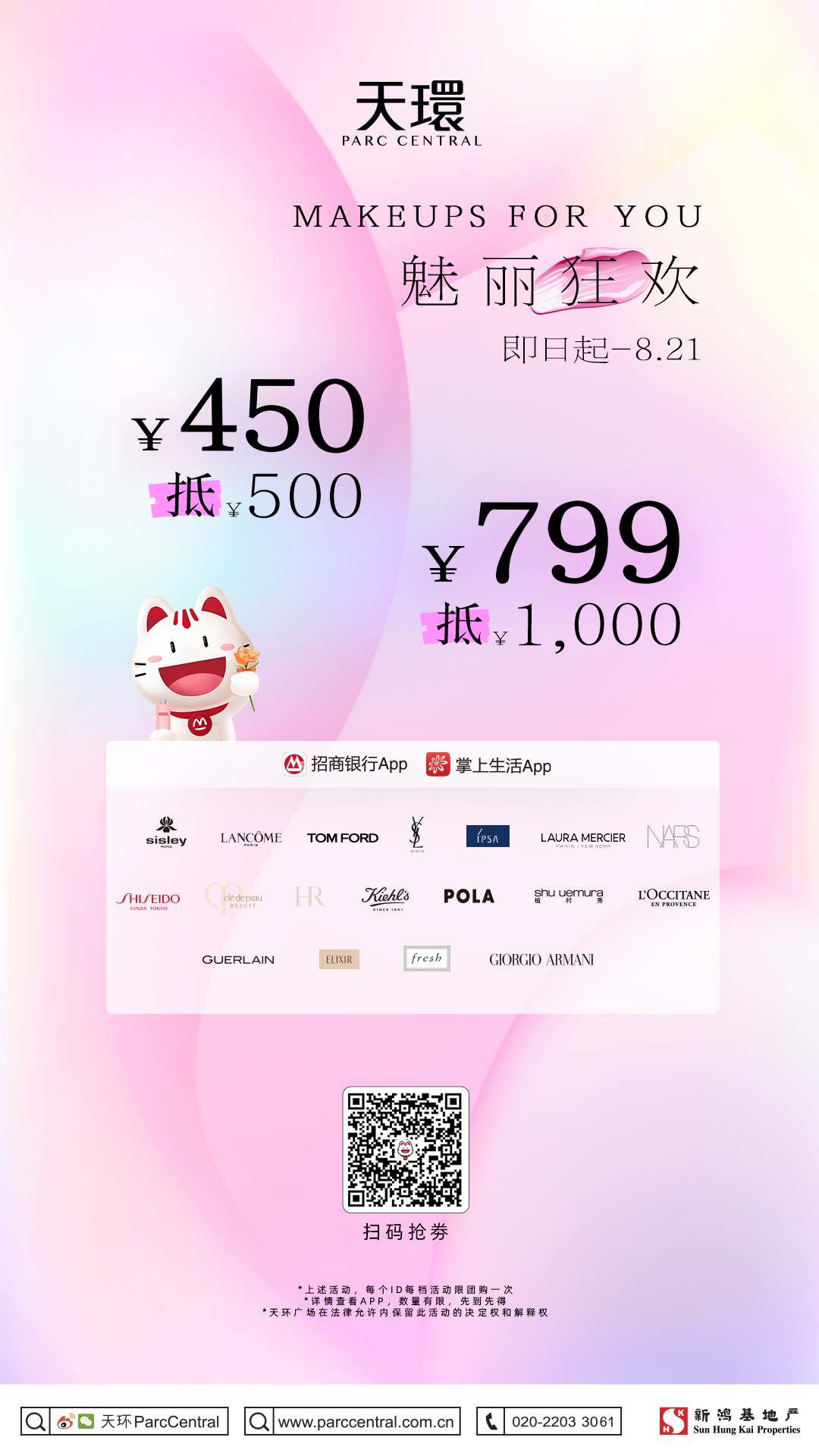 七夕将至,天环Parc Central联合招商银行打造七夕“魅丽宠粉节”,助力浪漫升温。8月4日至8月21日,凡在指定美妆商户消费,可享¥799团¥1000、¥450团¥500限时优惠。七夕当天,天环携手GODIVA为有情人准备节日专属的甜蜜巧克力DIY手工坊,会员可为心爱的TA亲手制作一份饱含心意的巧克力甜品,共同品尝唇齿间的馥郁香甜。即日起至8月7日,高端法国化妆品牌sisley携新品「凤舞莺歌」全能乳液限量版重磅登陆天环L1室内中庭开启华南首展,邀你一同探寻凤舞莺歌「全能」植萃秘境。“唔该晒!叹世界!YOU ARE MY HEAPY SUNSHINE”荔枝熊家族内地首展持续进行中,是七夕情侣“晒恩爱”打卡好去处。