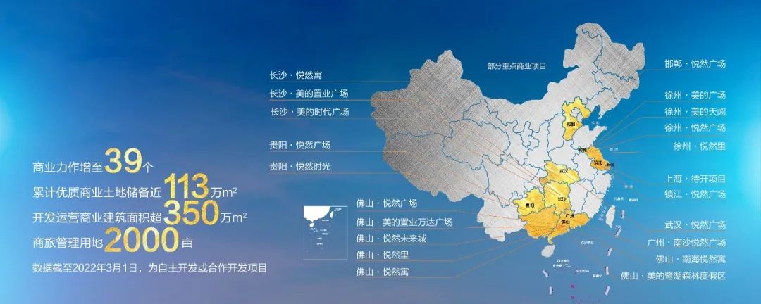 不仅如此,秉持“设计城市美好生活”理念的美的商业,始终在践行“城市综合体+邻里中心”双轨并行战略,布局珠三角、长三角等5大核心经济区,深耕落地39个精品项目,累计优质商业土地储备近113万方,开发运营商业建筑面积超350方。