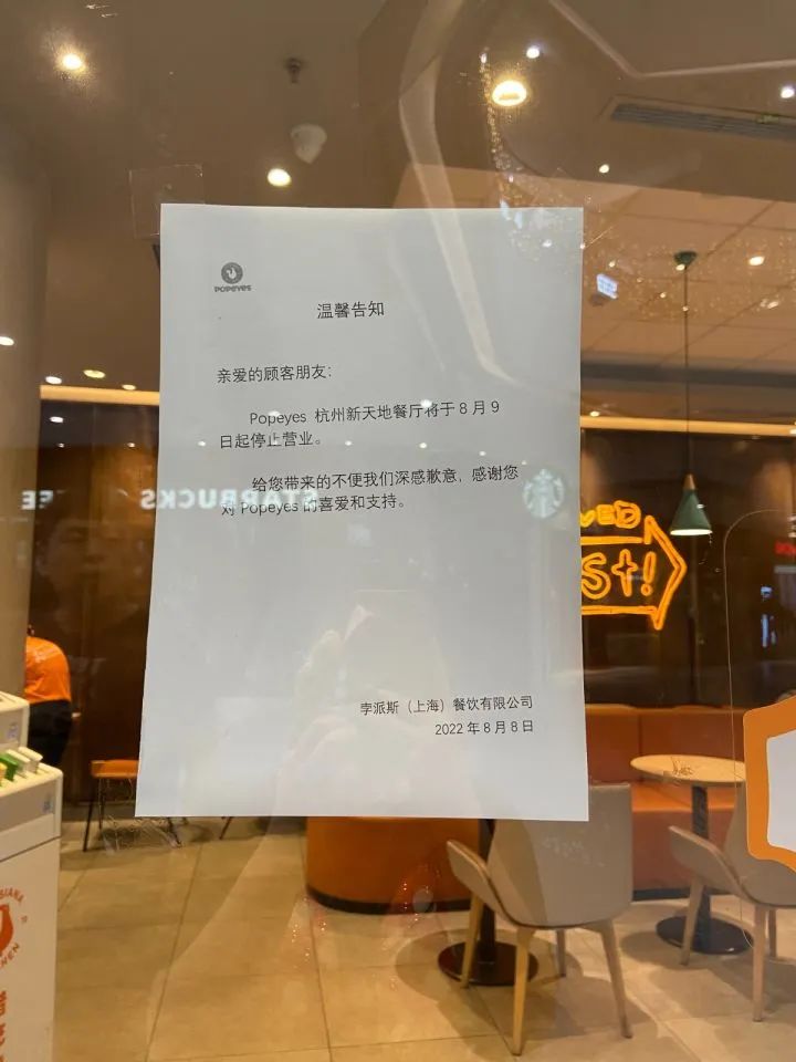 闭店消息传出后,有记者立即赶到Popeyes新天地店。发现位于商场内的出入口玻璃上贴了一张“温馨告示”,告知“Popeyes杭州新天地餐厅将于8月9日起停止营业”,落款时间是8月8日。