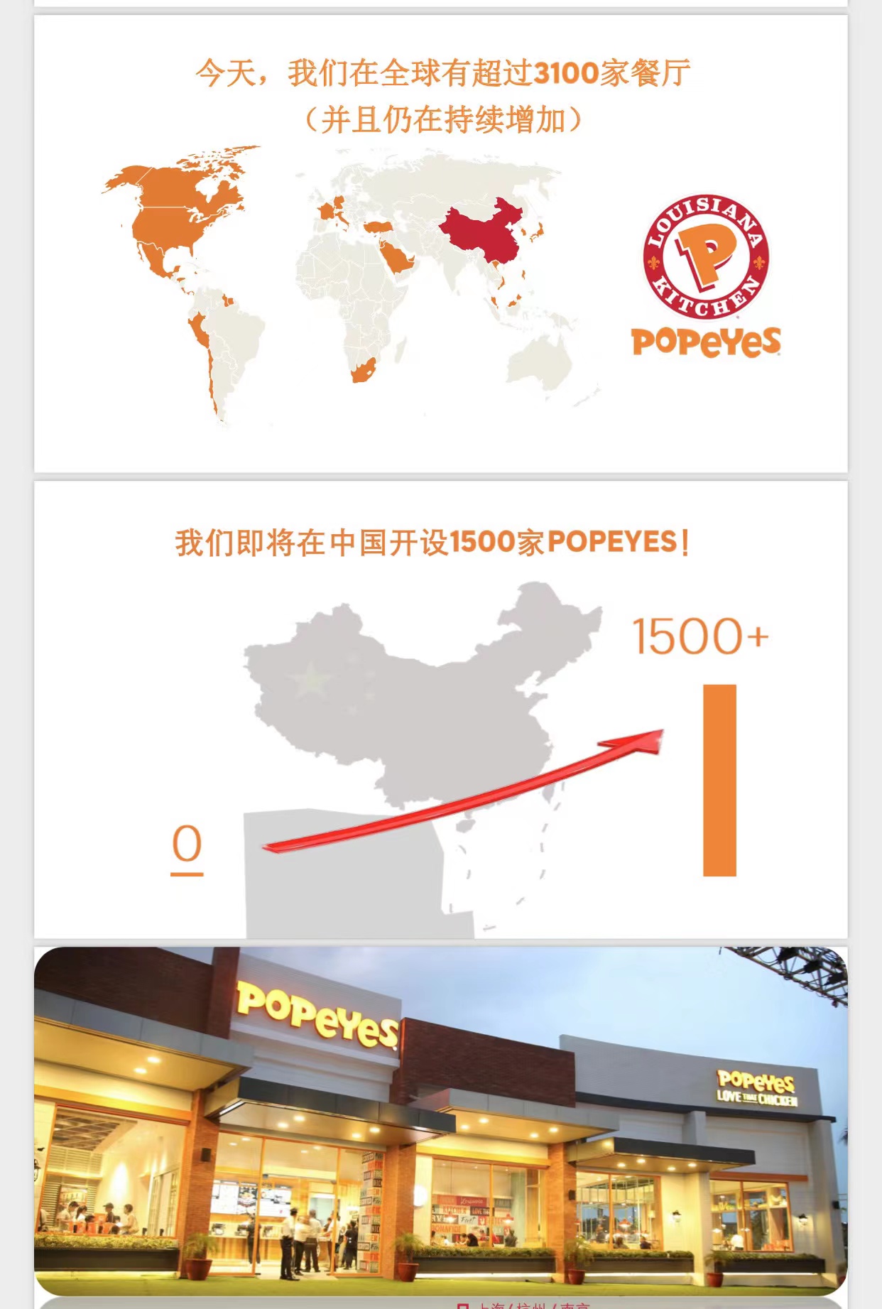 Popeyes微信公众号显示,Popeyes在中国总共有9家门店,杭州两家,上海六家,南京一家。事实上,Popeyes并非首次进入中国内地,也不是第一次黯然退场。据相关公开资料显示,早在1990年,该品牌曾以“派派思”的中文名在北京王府井开出首店,不过彼时中国消费者对炸鸡的接受程度有限,于2003年退出了中国市场。2019年7月,Popeyes宣布与本地合作伙伴TFI TAB食品投资公司合作进入中国市场时,曾表示,未来10年计划在中国新开门店1500家。
