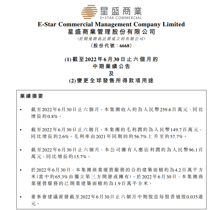 8月25日,星盛商业管理股份有限公司(以下简称“星盛商业”)发布截至2022年6月30止六个月的中期业绩公告。