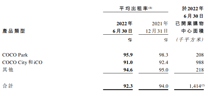 报告显示,「COCO Park」平均出租率达95.9,「COCO City」及「iCO」平均出租率达91.0%。截至报告期末,星盛商业向92个商用物业项目提供服务,覆盖中国29个城市,总合约建筑面积约420万平方米(不含36个咨询服务项目建筑面积),当中约65.3%由独立第三方开发或拥有。其中,有25个已开业零售商业物业,已开业建筑面积约为190万平方米。