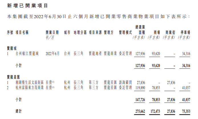截至2022年6月30日,宝龙商业共有91处已开业零售商业物业,总已开业建筑面积约为1020万平方米,较2021年12月31日约990万平方米上升约30万平方米;已签约零售商业物业140个,总合约建筑面积约为1470万平方米。