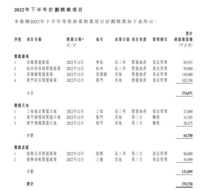 2022下半年,宝龙商业计划开业零售商业物业项目包括余姚宝龙广场、杭州科技城宝龙广场、景德镇宝龙广场、厦门同安宝龙广场、上海嘉定宝龙天地、厦门固博苑宝龙天地、厦门塘边宝龙天地、绍兴金帝宝龙广场等9个项目。