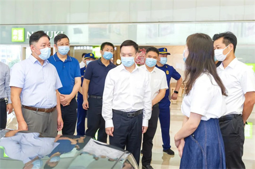 9月28日,国庆节前夕,步步高梅溪新天地迎来了一场“随堂考试——湖南湘江新区(长沙高新区)党工委副书记、管委会主任,岳麓区委副书记、区长何朝晖,带领应急管理、卫健、商务和市监等部门相关负责人,就节前市场安全生产和疫情防控问题对梅溪新天地进行了检查。步步高集团董事长王填陪同检查,并就如何更好地做好相关管理进行了深入交流。