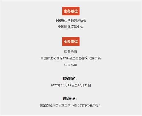 为迎接党的二十大胜利召开,贯彻习总书记提出的“坚持人与自然和谐共生”的理念,弘扬生态文明建设主旋律,展示野生动物保护成果,实现绿色发展美丽新图景,10月13日,中国国际贸易中心联合中国野生动物保护协会共同举办的“喜迎二十大”野生动物摄影展在国贸商城北区地下二层中庭(西西弗书店旁)揭幕开展。
