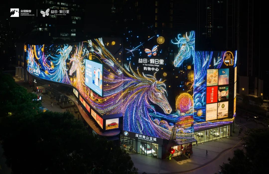 4000㎡“以梦为马”户外灯饰画焕新启幕,此次灯饰画以"马”为拟人化视角,以此承载人们内心的梦想,作为人们前进的动力,共赴未来美好生活。白天静态的建筑幕墙,夜晚则变幻为巨幅梦幻灯光展,开启城市“夜经济”消费时光。