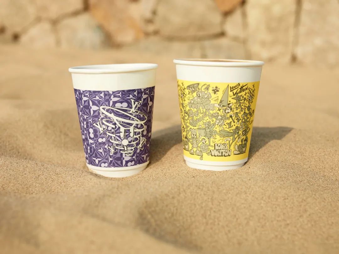 比如连锁咖啡品牌Manner便借此机会与LV进行联名,推出两款LV秀场定制咖啡杯,一款采用LV经典花纹图案,一款采用明亮的黄色与充满童趣元素。而除了和咖啡联名,LV还在阿那亚搭建报刊亭,出售主题画册、杂志、贴纸等,售价250-2500不等,每单交易赠送LV logo帆布包。