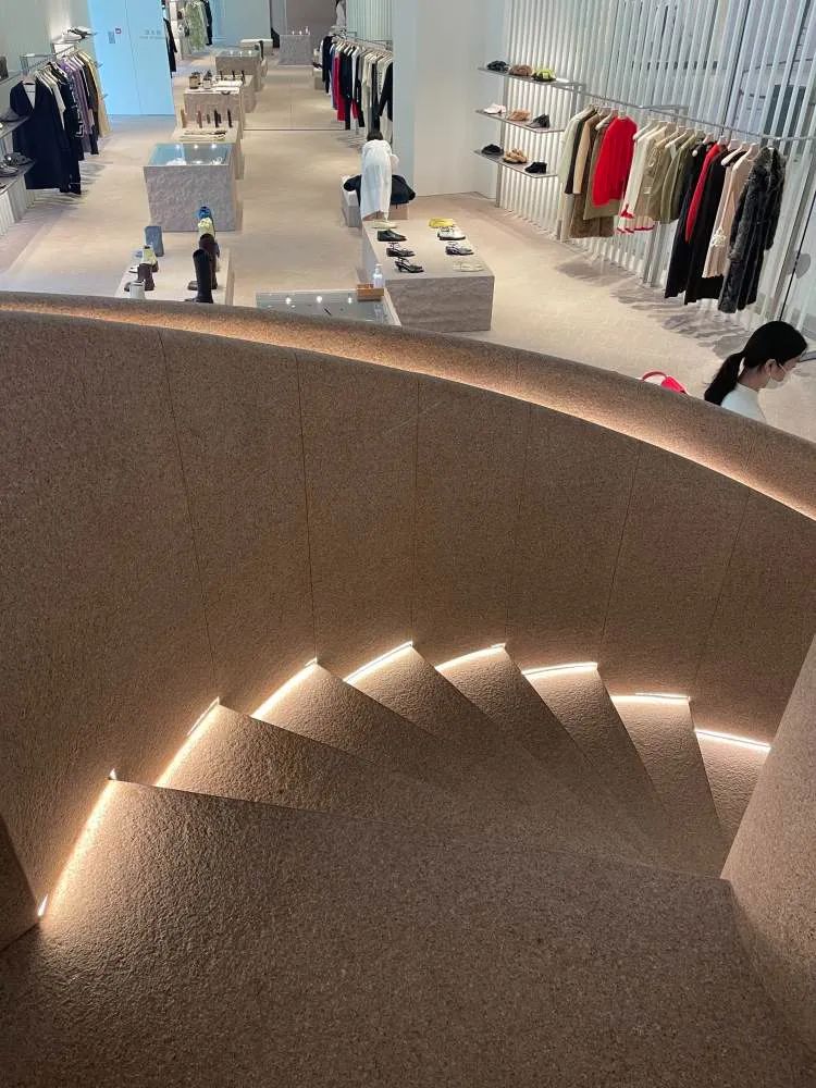 JIL SANDER创意总监Lucie和Luke Meier携手英国著名设计师John Pawson,共同打造了这个简约细腻、优雅柔和的空间。陈列架和旋转楼梯的几何感很强,线条、材质、光线等等方面充满美学细节。二层专属空间内设置JIL SANDER FLORA项目,绿植和花卉装置根据季节和主题每月变换不同设计。