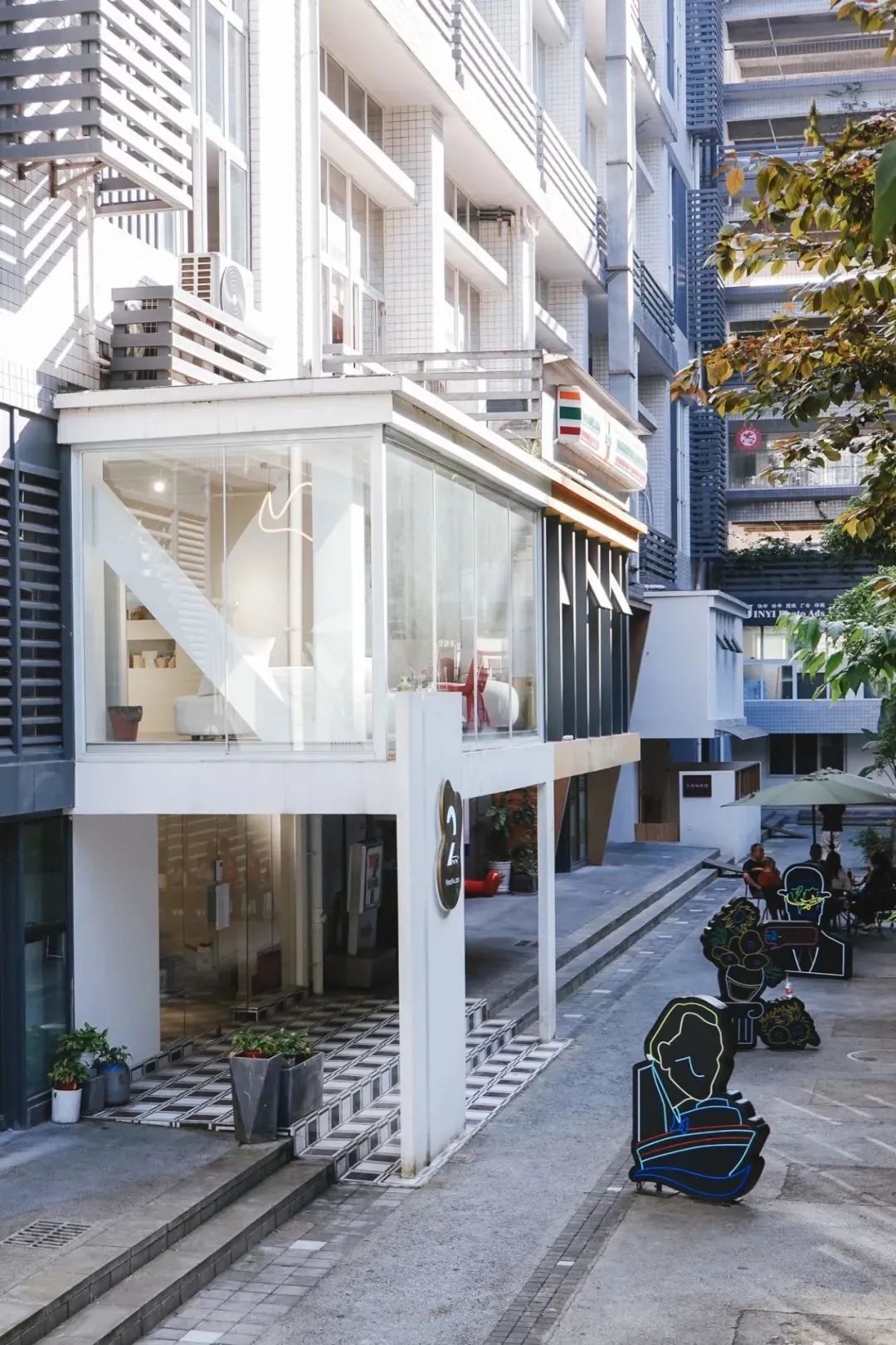 首层以标准社区功能组合——咖啡、餐酒吧、自营的DEMOLAB快闪策展空间、买手店,家具、绿植花店等,二层主要由运动瑜伽、服饰定制、婚礼定制、儿童插画等工作室组成。