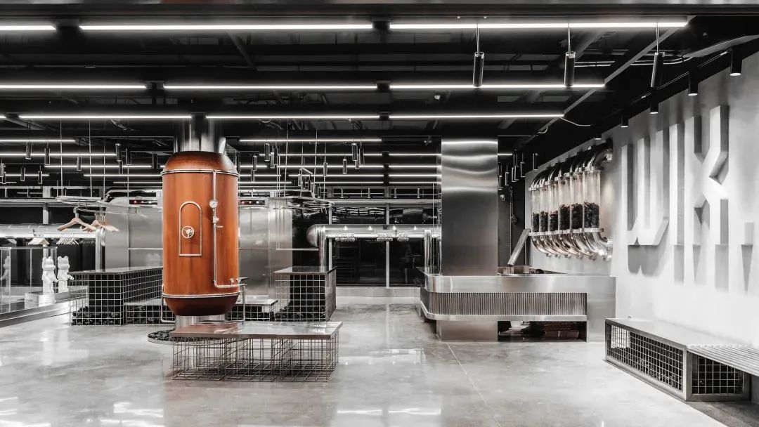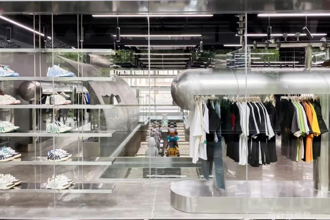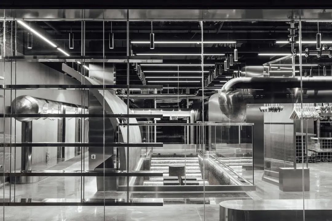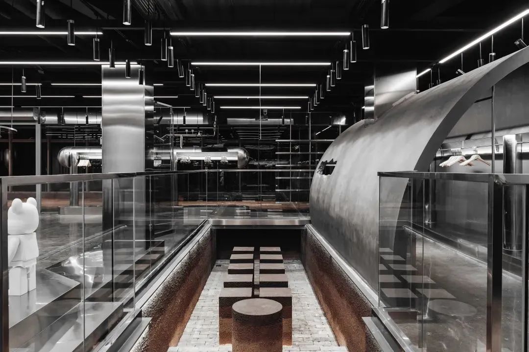 选用不锈钢作为空间的主要材质,充斥着未来感。在颜色上,不锈钢的冷色调与厂房的水泥肌理形成自然过渡,透过落地玻璃,室内空间与整个厂房的工业调性达成协调统一。同时,通过展陈形式错落摆放的商品,以适应新时代消费人群的购物体验。