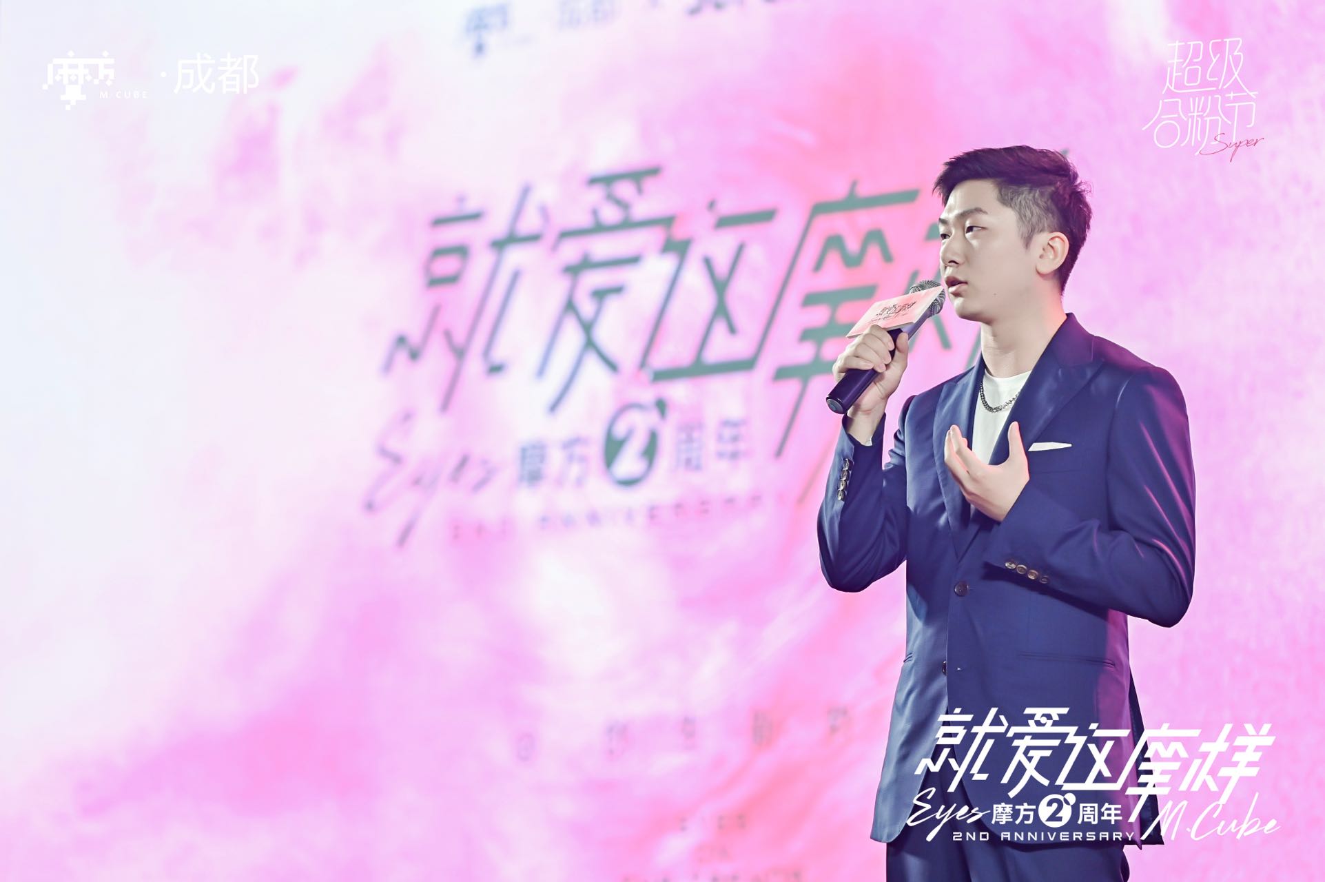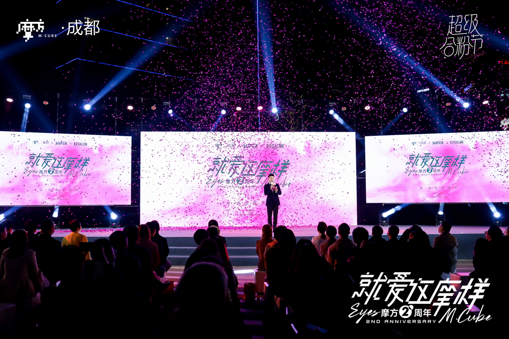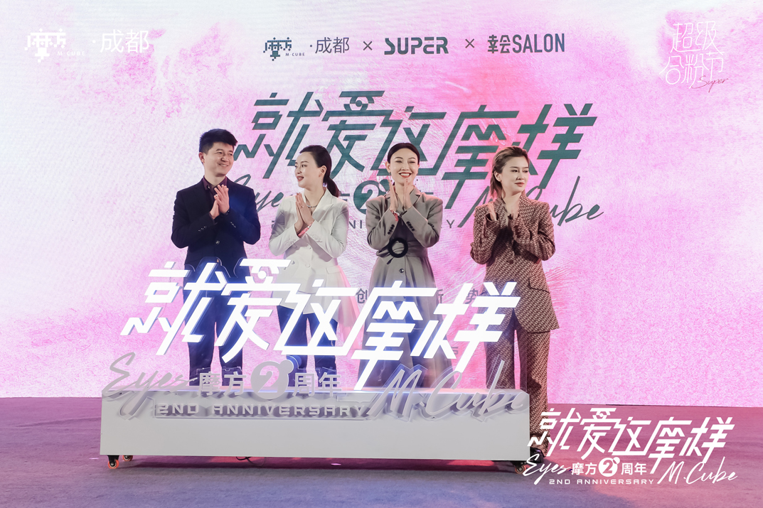 随后成都石羊街道办党工委委员及办事处副主任邓世奇先生、合景·摩方(成都)项目及合景·瑧林天地(成都)项目总经理杨玲女士、《SUPER世界青年》出版人陈佳伦女士、幸会SALON创始人徐晨郗女士一起点亮就爱这摩样装置,开启两周年盛典!