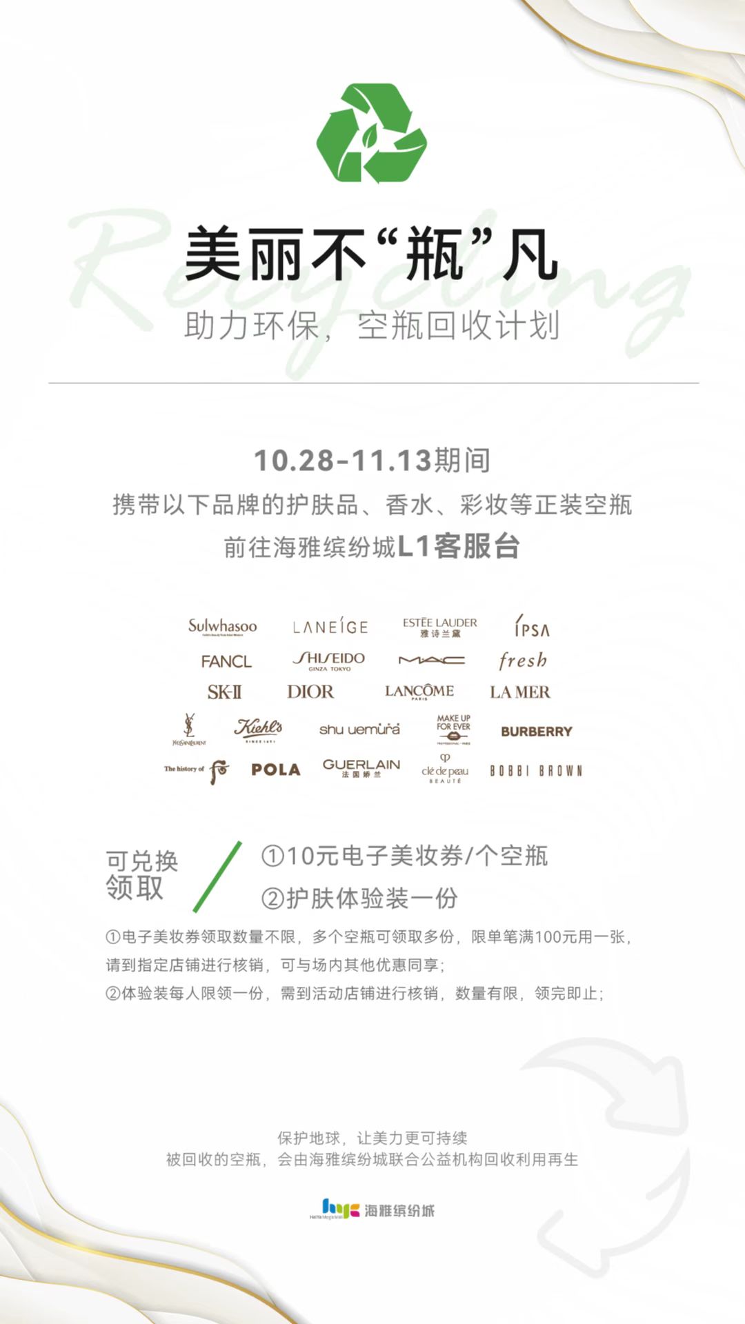 10月28日-11月13日,海雅缤纷城便重磅开启了环保特别企划【空瓶回收计划·美力不瓶凡】公益活动,联合BURBERRY、DIOR、ESTEE LAUDER等场内20余家国际美妆品牌,呼吁消费者一起加入空瓶回收计划,共同关注环保事业,为保护环境付出一己之力,以空瓶回收再利用的形式将公益精神、环保意识传播给更多的消费者。除此之外,海雅缤纷城为参与空瓶回收的消费者准备了现金券及品牌体验包等诸多好礼。