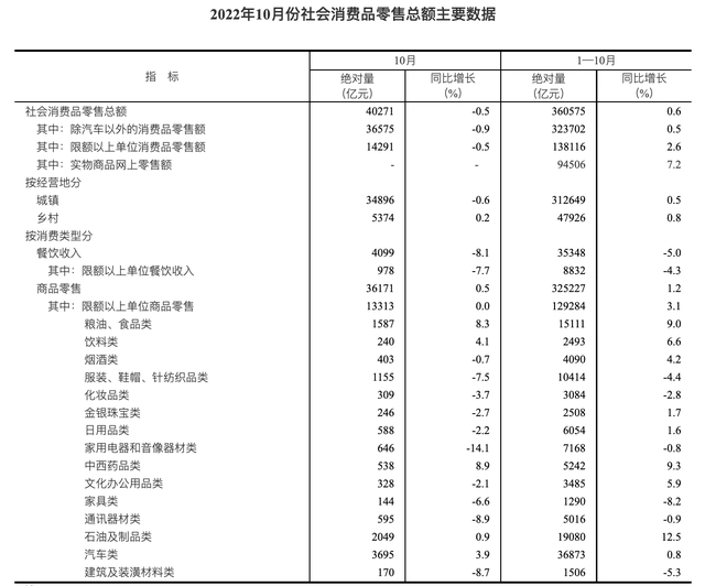 11月15日,国家统计局发布居民消费价格指数月度报告。10月份,社会消费品零售总额40271亿元,同比下降0.5%。其中,除汽车以外的消费品零售额36575亿元,下降0.9%。1—10月份,社会消费品零售总额360575亿元,同比增长0.6%。其中,除汽车以外的消费品零售额323702亿元,增长0.5%。按消费类型分,10月份,商品零售36171亿元,同比增长0.5%;餐饮收入4099亿元,下降8.1%。1—10月份,商品零售325227亿元,同比增长1.2%;餐饮收入35348亿元,下降5%。